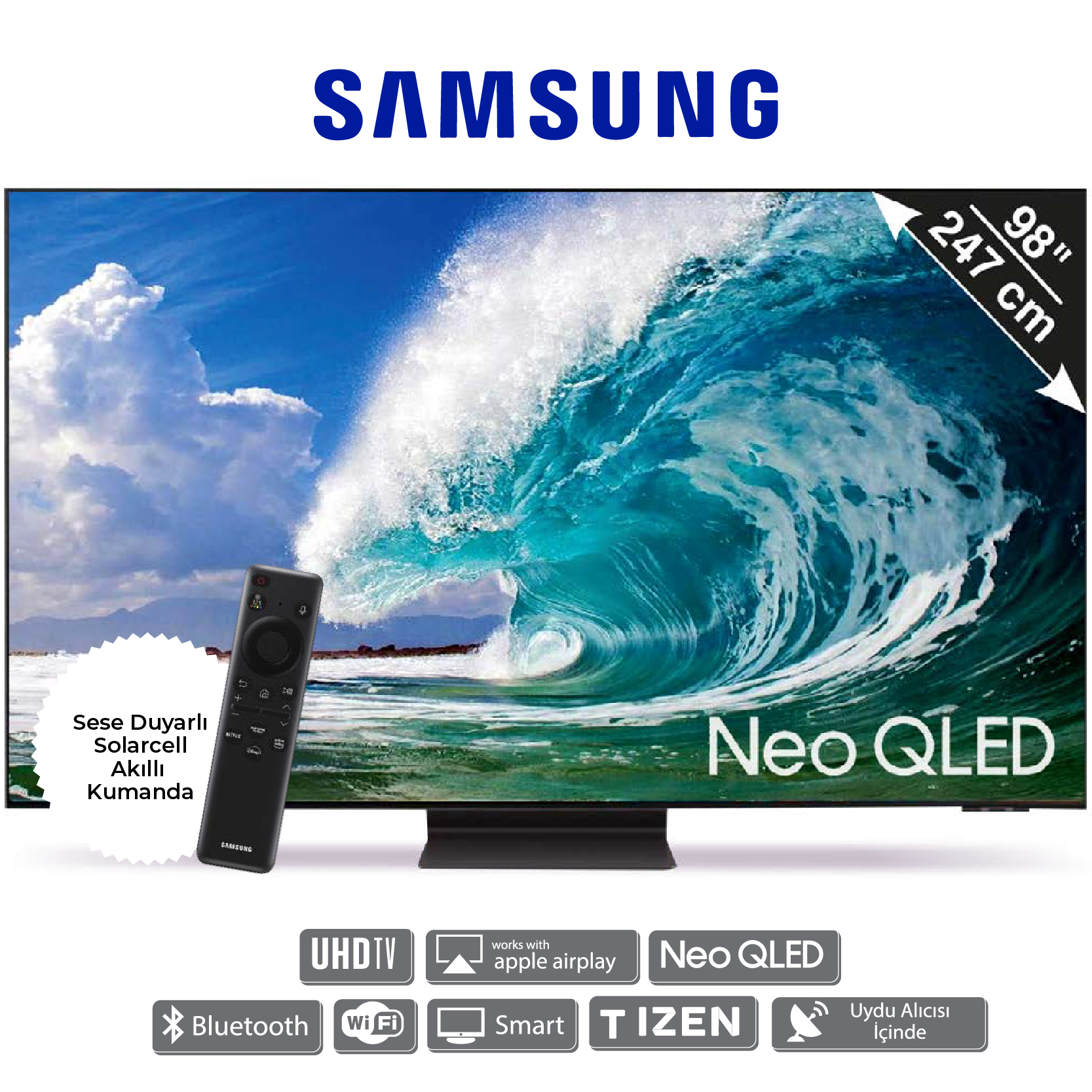 3840×2160p 4K UHD çözünürlük, Neo QLED ekran teknolojisi, Mini LED aydınlatma, 120 Hz ekran yenileme hızı, HDR10+ Adaptive ve HLG desteği, 4×HDMI 21 ve 3×USB bağlantı girişi, Dolby Atmos ve OTS+ surround ses teknolojisi, Neural Quantum 4K işlemci, Tizen işletim sistemi, Premium Smart TV ve Oyun Modu Pro özellikleri